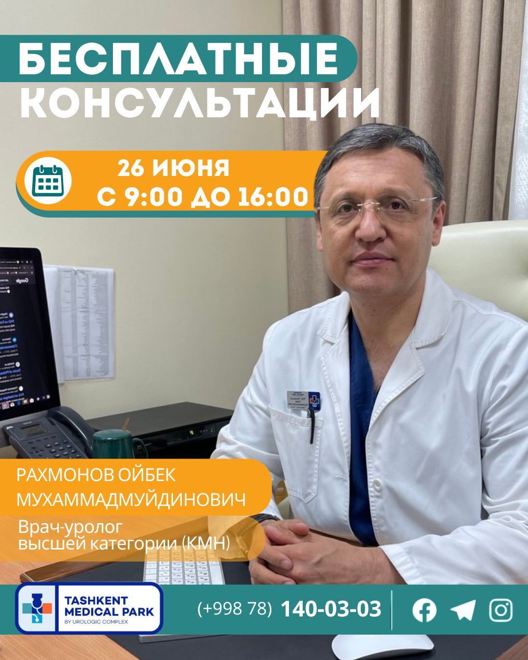 🚨 Faqat 26-iyun — Urologlar majmuasi tomonidan Tashkent Medical Parkda urologning bepul maslahati